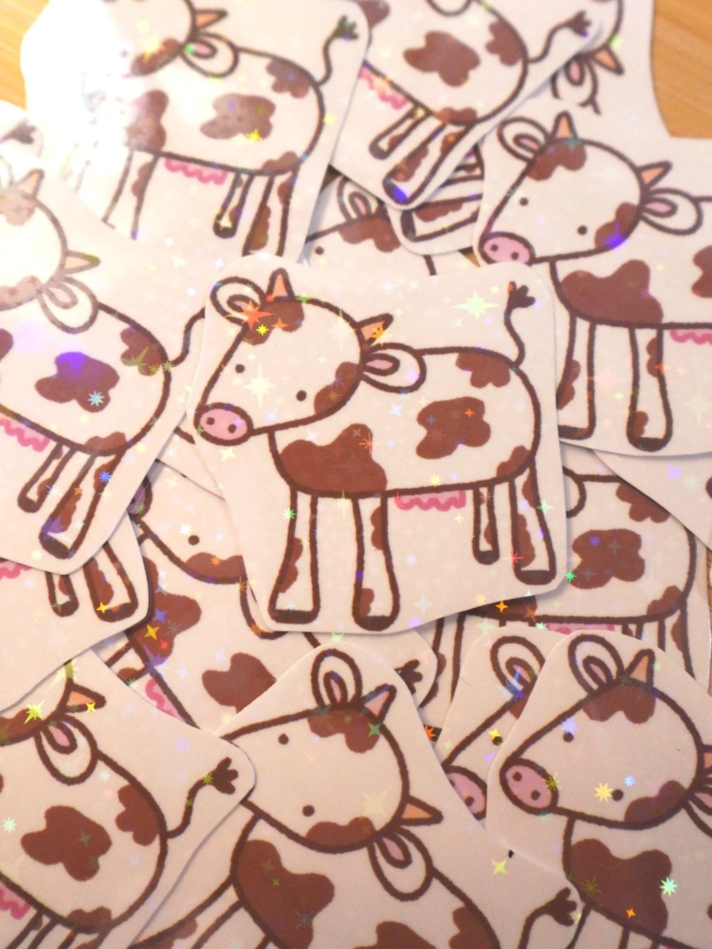 Cute little brown cow sticker :) he probably makes really tasty chocolate milk too!! These stickers are printed on a matte vinyl sticker paper and then coated in a starry holographic film and hand cut when assembled!